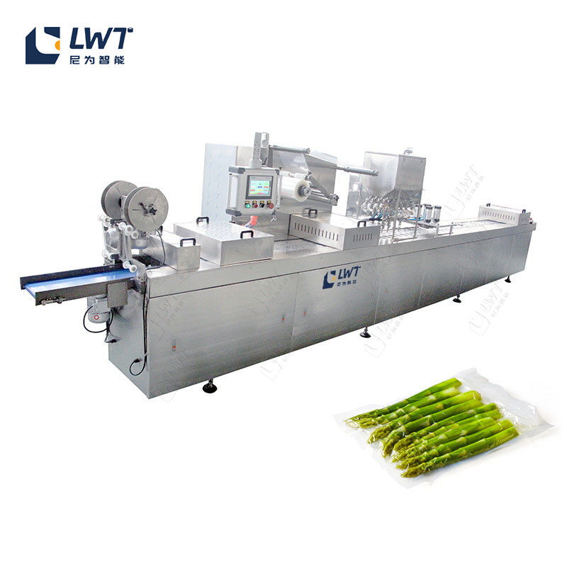 Automatyczne termoformowanie i maszyna do pakowania próżniowego przyjmuje rozciągalną i termoplastyczną płytę miękką lub twardą kartę do tworzenia pojemnika, a próżniowanie lub uszczelnianie MAP i cięcie po napełnieniu.